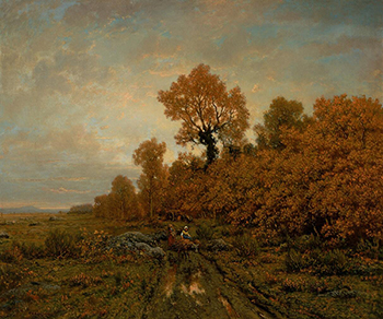 At the same time, these landscapes bore witness to change. Expanding roads, railways, and industrial demands stripped the forest of wood and stone to fuel Paris’s growth, even as artists sought to preserve its rustic beauty and quiet reverence on canvas. Théodore Rousseau, whose ecological activism contributed to establishing parts of Fontainebleau forest as the world’s first nature reserve, contrasts the grandeur of towering trees and open land with the much smaller figures of wood gatherers in Edge of the Woods (Plain of Barbizon near Fontainebleau) (c. 1850–1860), situating them within the landscape to suggest human scale in nature. Rousseau’s careful observations became an enduring influence on artists such as Claude Monet, whose Woodgatherers at the Edge of the Forest (c. 1863) echoes Rousseau’s tranquil scene but with a lighter palette and more spontaneous brushwork that foreshadows key qualities of Impressionism.