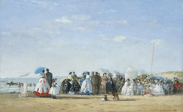 Alongside scenes of labour, waterways also became spaces of leisure. Railways and steamboats made coastal destinations more accessible, and the rise of seaside tourism inspired artists to capture urbanites enjoying holidays. Eugène Louis Boudin’s Fashionable Figures on the Beach (1865) presents a luminous and detailed view of beachgoers. Through his refined composition, Boudin utilizes careful observation to portray both the social rhythms of leisure and the evolving culture of tourism. By depicting both work and play along rivers, canals, and coasts, artists explored the full spectrum of modern life, conveying its activity, travel, and pleasures.