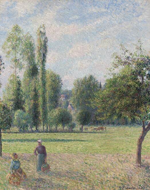 Two Peasant Women in a Meadow (Le Pré) (1893) illustrates Pissarro’s effort to merge the precision of a more Pointillist brushstroke with the spontaneity and freedom of Impressionist observation. The painting shows two women conversing as cows graze in the background, rendered in small, careful strokes that convey the textures of the field, fabrics, trees and sky, capturing a moment that feels lived and immediate.