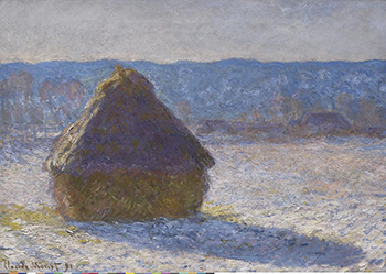 Monet’s method was inseparable from his immersion in nature. Poppy Field in a Hollow near Giverny (1885), a depiction of the lush countryside around his home, demonstrates his sensitivity to both the grandeur and intimacy of the rural landscape. The stacked hay in the middle distance anticipates his iconic Grainstack series from several years later. One example, Grainstack (snow effect) (1891), exemplifies Monet’s study of shifting light and seasonal change. He painted at least twenty-five canvases of grainstacks in Giverny, transforming a familiar subject through time and weather. Here, sunlight glances across a dusting of snow, brightening an otherwise chilly, wintry day. The painting illustrates Monet’s meticulous observation of a single subject under changing conditions, turning an everyday rural view into a meditation on perception, memory, and the passage of time.