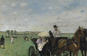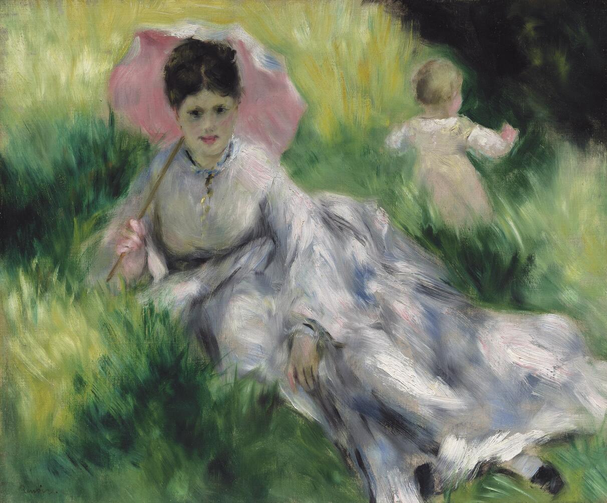 In Pierre-Auguste Renoir’s Woman with a Parasol and Small Child on a Sunlit Hillside (c. 1874–76), soft, feathery brushstrokes depict a woman, likely Claude Monet’s wife, Camille Monet, sitting gracefully on a hillside, her white dress dappled with shifting sunlight, while a small child wanders into the background, seemingly unaware of the painter’s presence. Edgar Degas’ At the Races in the Countryside (1869), shown at the First Impressionist Exhibition, foregrounds a family scene centred on a baby, while mounted onlookers glimpse horses mid-race across a sparse Normandy landscape. Painted in a very different style than Renoir, Degas’ careful observation and unusual cropping nonetheless also convey the sense of a fleeting moment, as if the viewer has stumbled upon the scene. Such examples reveal how the Impressionists turned to the direct experiences of modern life in their work, capturing its atmosphere and transience, and placing fleeting moments at the heart of their art.