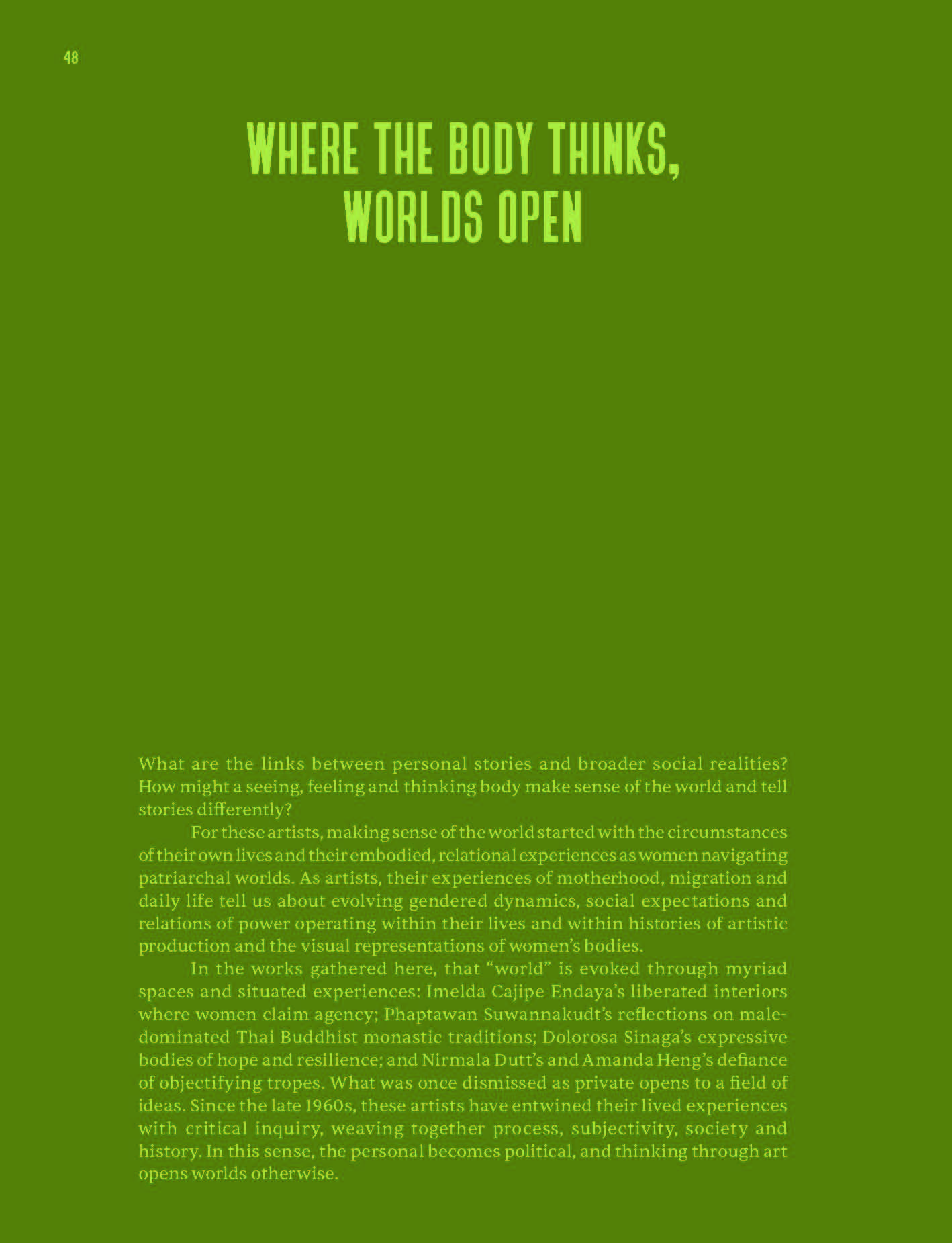This publication accompanies the exhibition Fear No Power: Women Imagining Otherwise. It constellates the practices of Nirmala Dutt, Imelda Cajipe Endaya, Amanda Heng, Dolorosa Sinaga and Phaptawan Suwannakudt—artists for whom art, life and community are intertwined. Spanning the 1960s to 2010s, their works engage questions of gender, labour and power amid the shifting social and political landscapes of Southeast Asia.