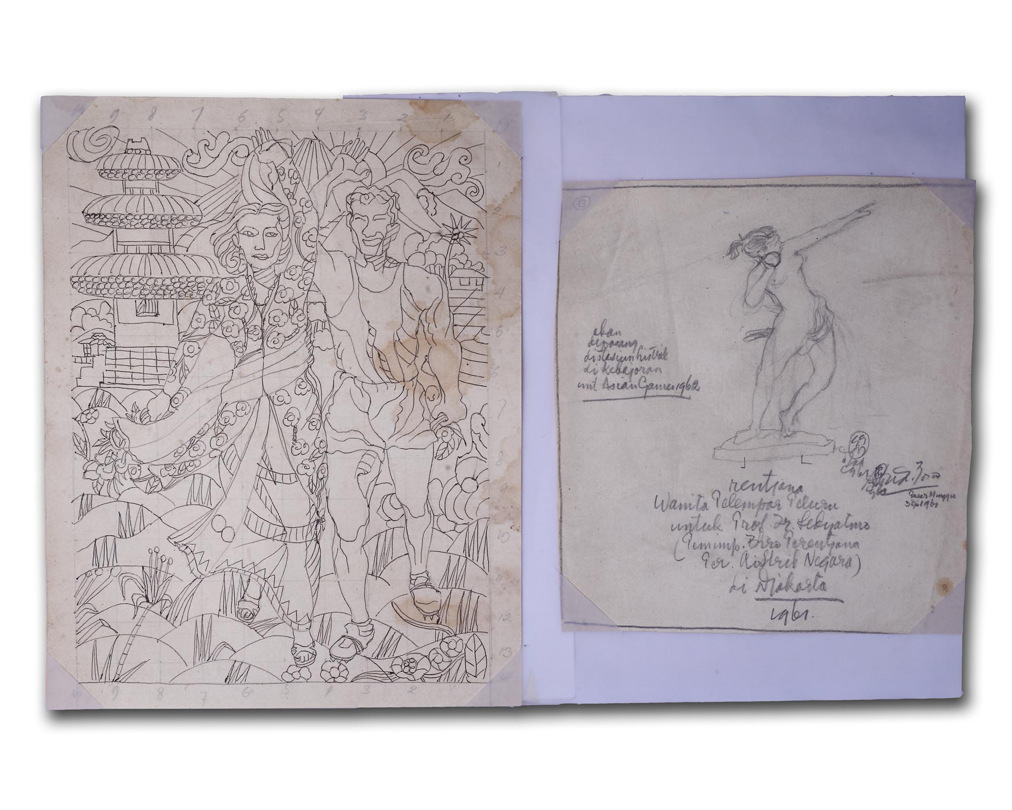 Sketches of Sudjojono depicting the plan of a mural/relief and the sculpture of Wanita Pelempar Peluru (Hammer-Throwing Woman) for Asian Games 1962