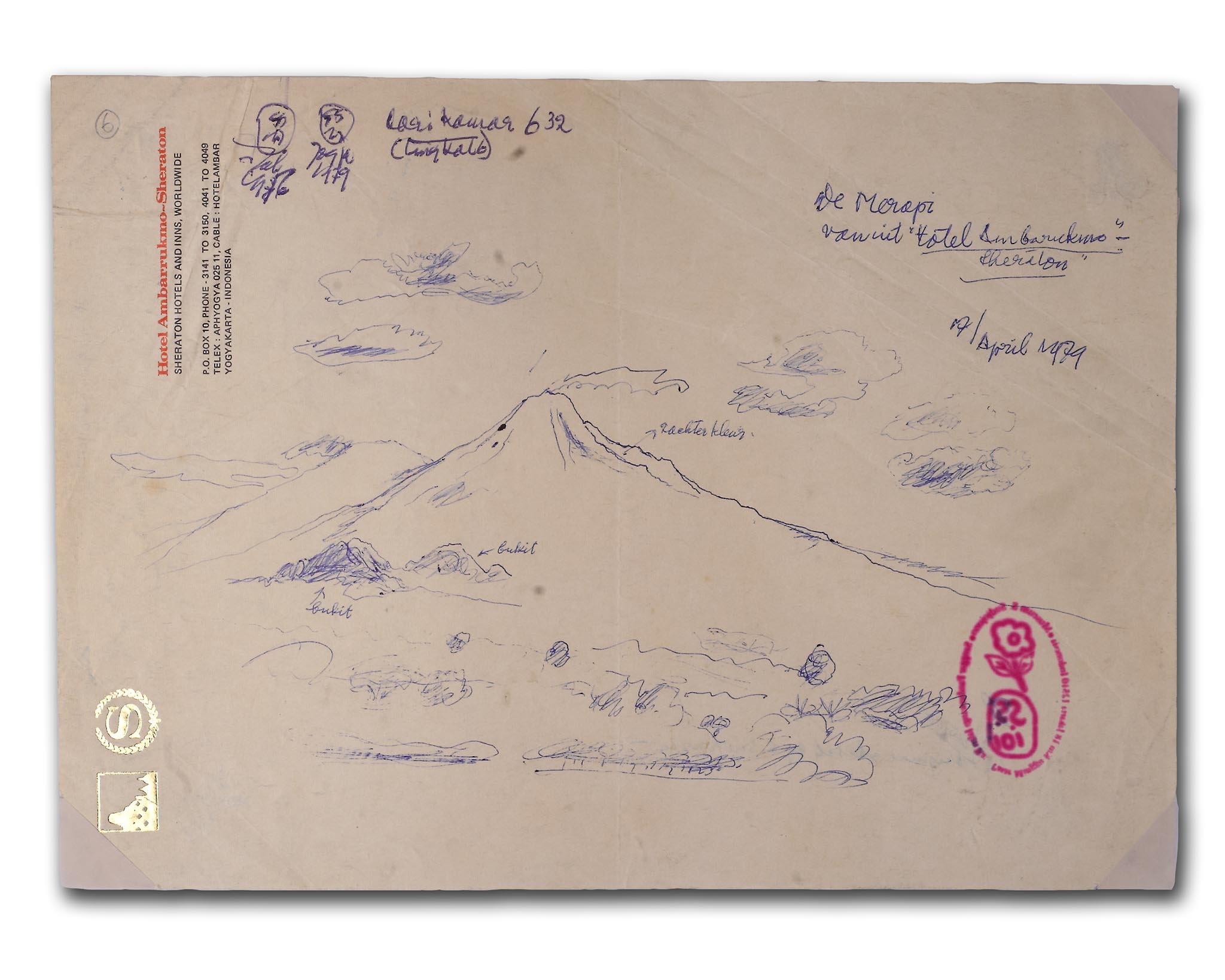 Sudjojono's sketch of the Merapi Mountain, on Hotel Ambarukmo letterhead paper, Yogyakarta