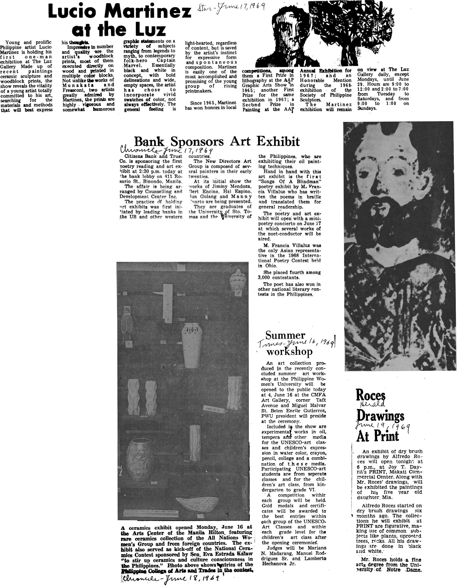 Lucio Martinez at the Luz; Bank Sponsors Art Exhibit; Summer Workshop; Roces Drawings At Print; [Photograph of Manila Hilton Ceramics Exhibit]