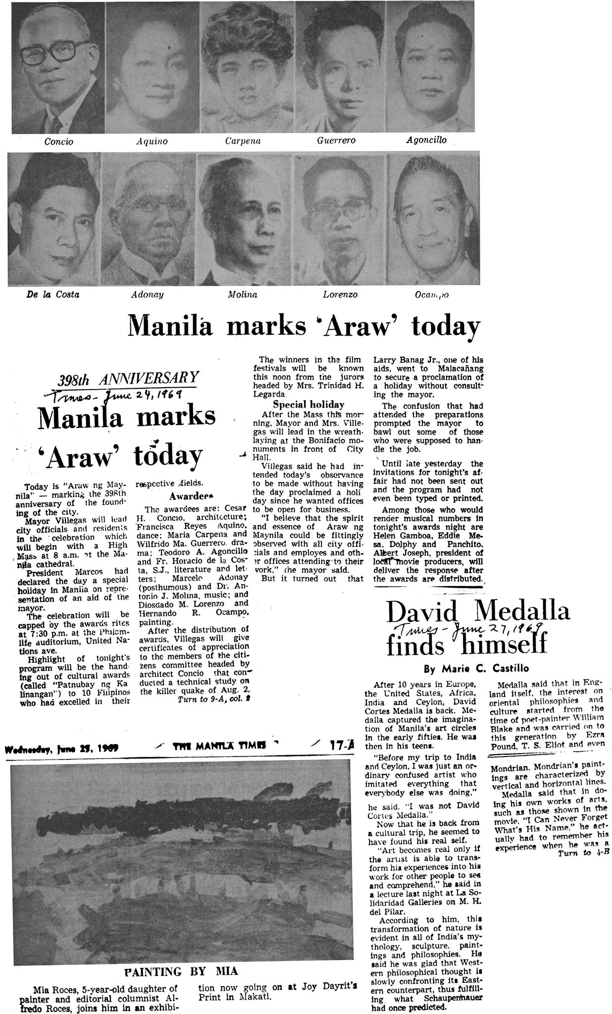 Manila marks 'Araw' today; Manila marks 'Araw' today [continued]; [Photograph captioned PAINTING BY MIA]; David Medalla finds himself