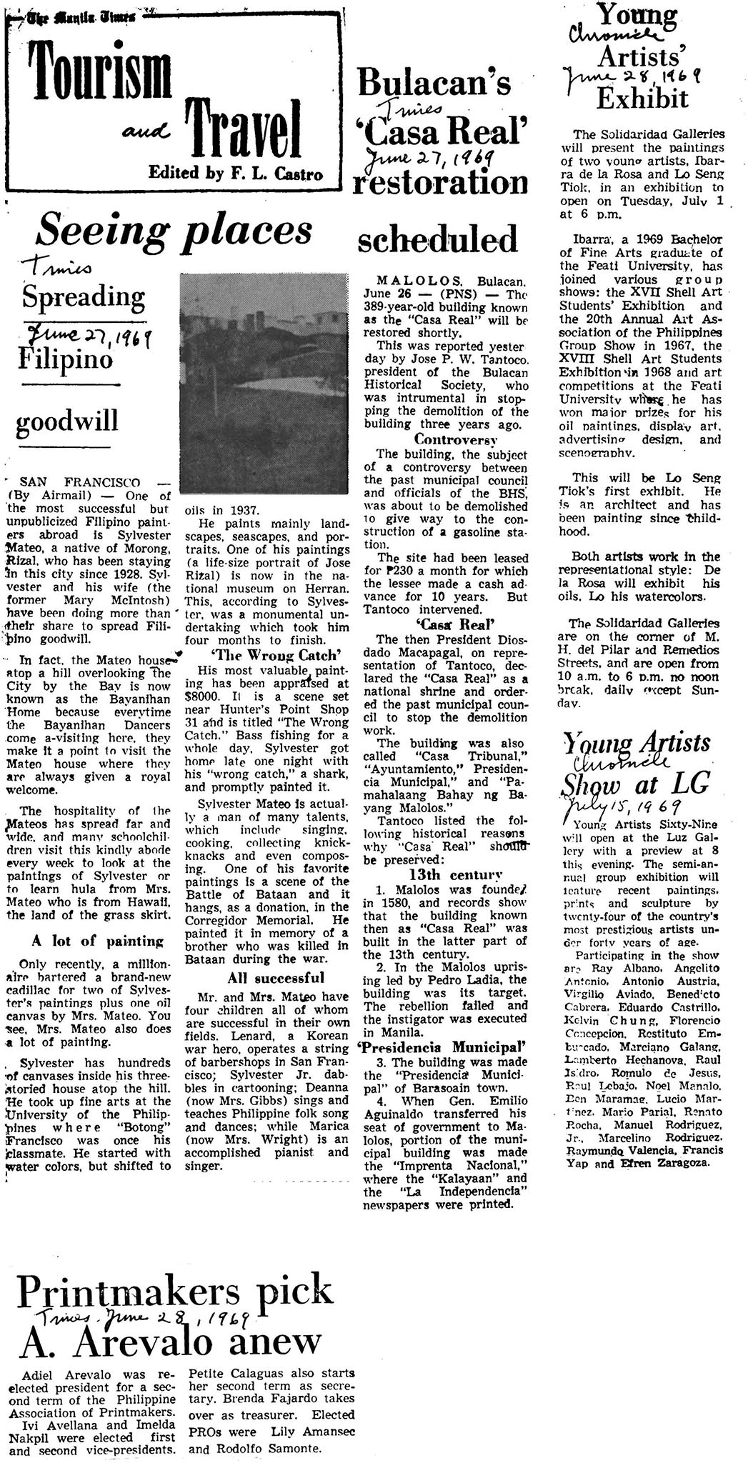 Spreading Filipino Goodwill; Bulacan's 'Casa Real' Renovation Rescheduled; Young Artists' Exhibit; Young Artists Show at LG; Printmakers pick A. Arevalo anew