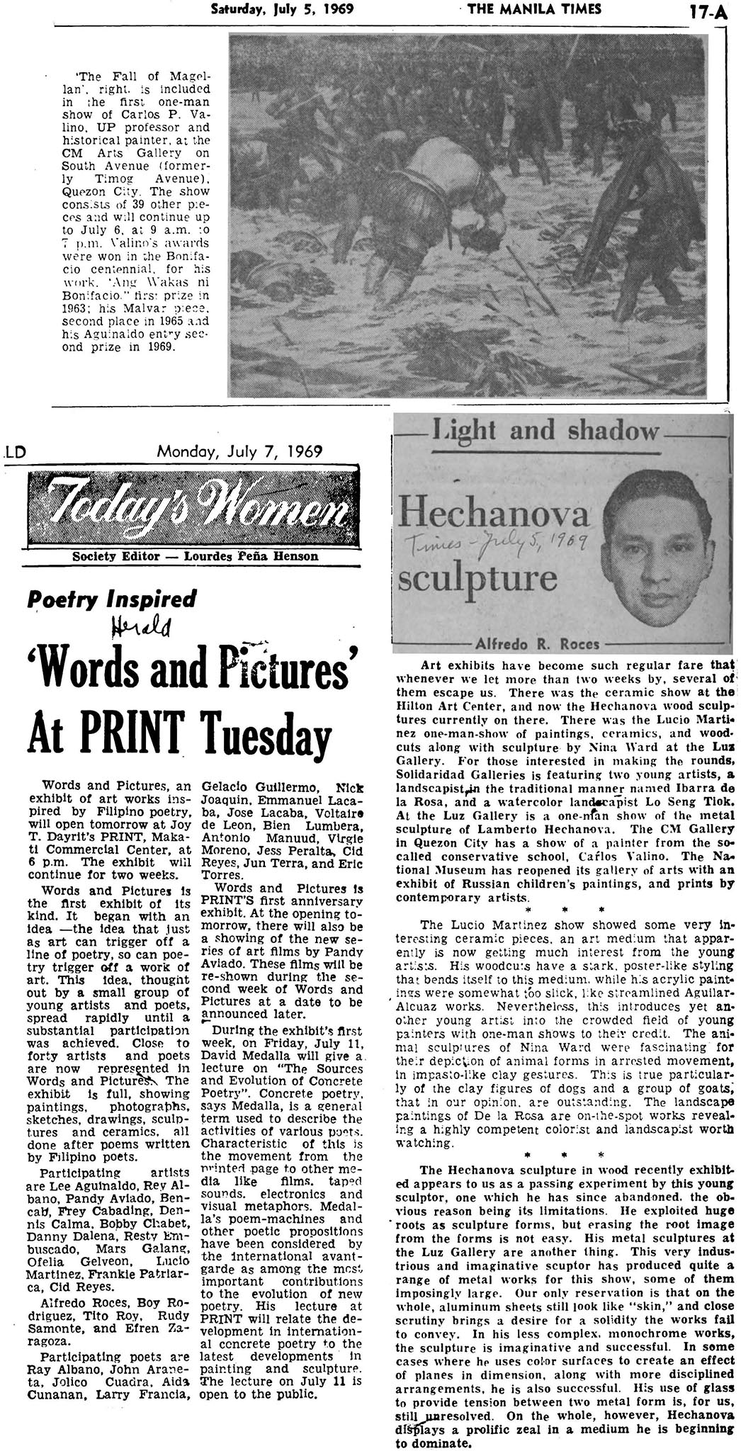 [Photograph of Carlos P. Valino's "The Fall of Magellan"]; 'Words and Pictures' At PRINT Tuesday; Hechanova sculpture