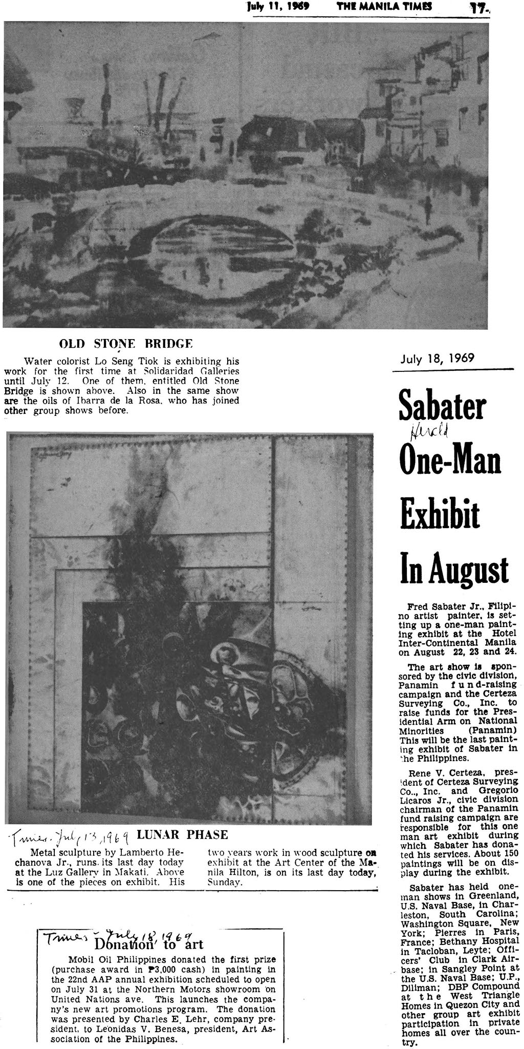 OLD STONE BRIDGE; Sabater One-Man exhibit in August; Lunar Phase; Donation to Art