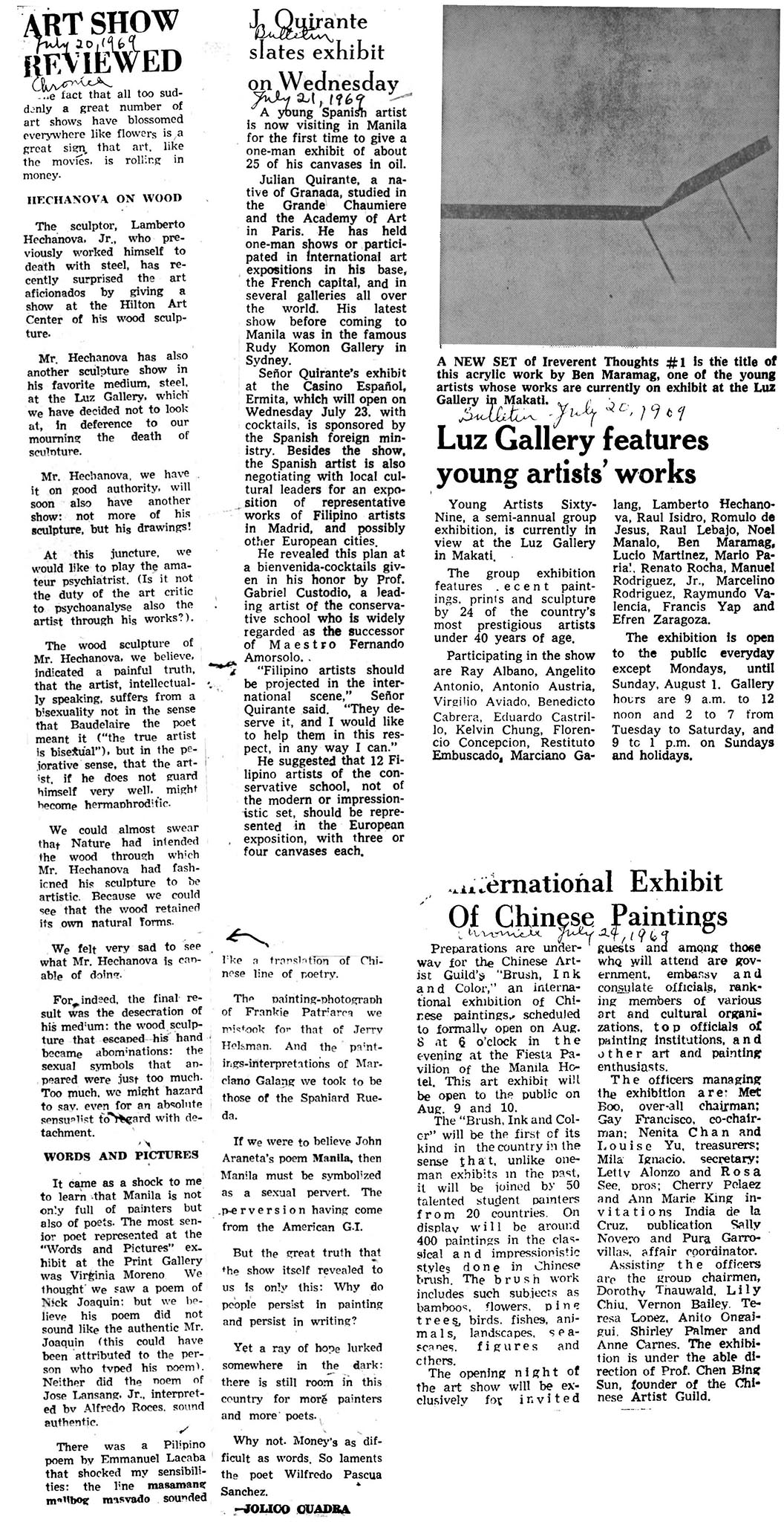 Art Show Reviewed; J. Quirante slates exhibit on Wednesday; Luz Gallery features young artists' works; International exhibit of Chinese paintings
