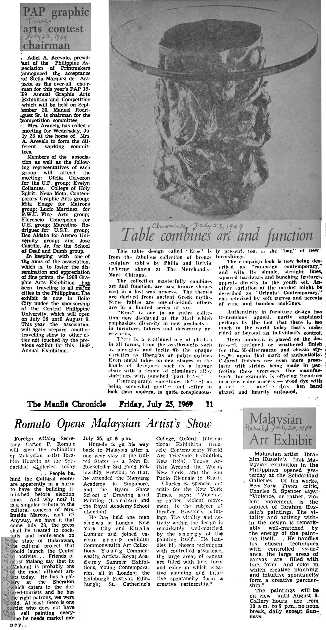 PAP graphic arts contest chairman; Table combines art and function; Romulo opens Malaysian artist's show; Malaysian Art Exhibit