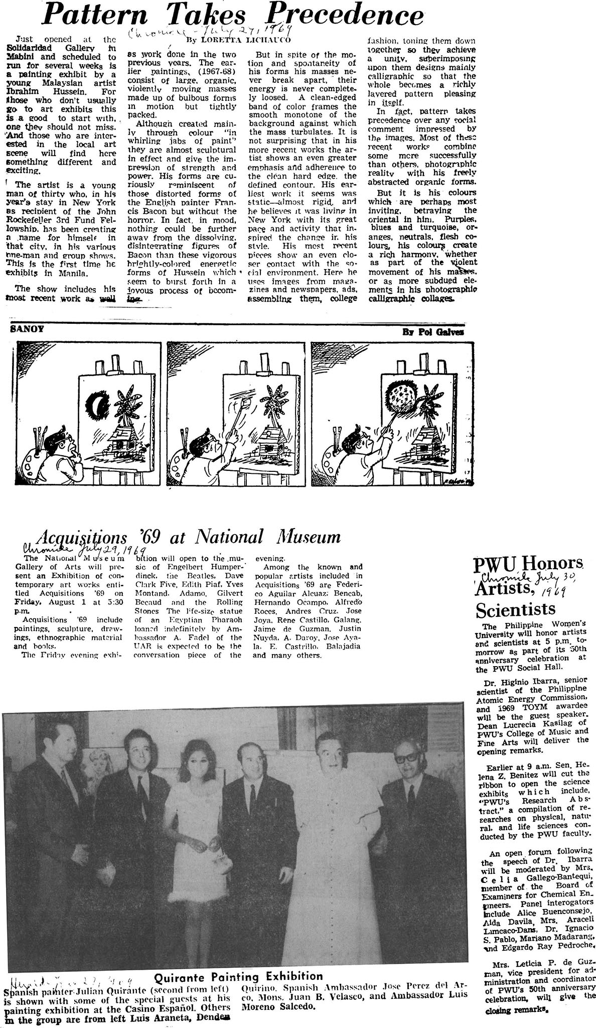 Pattern takes precedence; [Comic Strip: SANOY by Pol Galvez]; Acquisitions ' 69 at National Museum; PWU honors Artists, Scientists; Quirante Painting Exhibition
