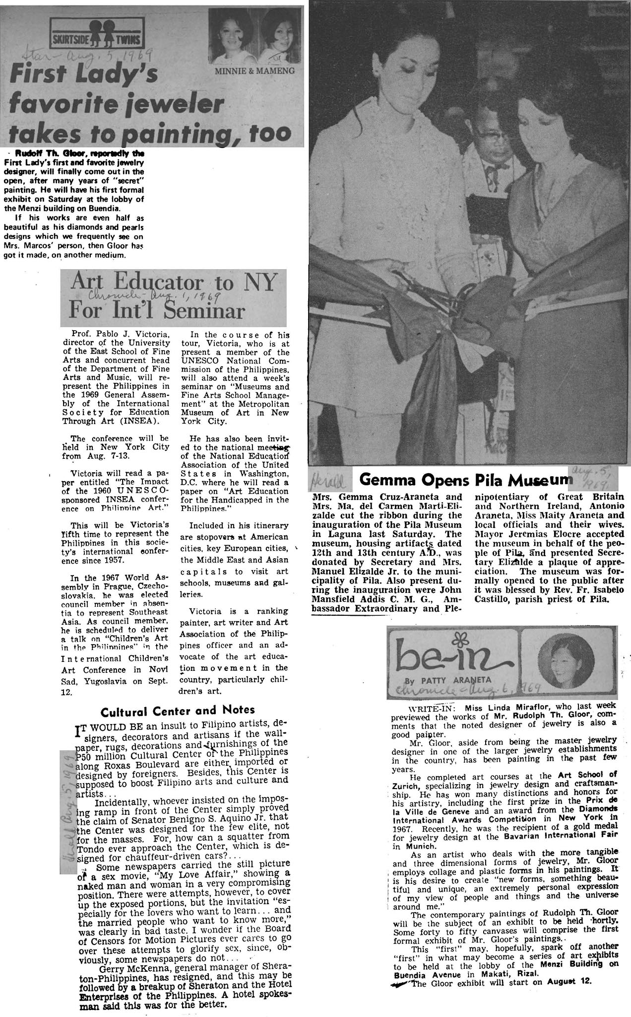 First Lady's favourite jeweller takes to painting too; Art Educator to NY for Int'l Seminar; Cultural Center and Notes; Gemma opens in Pila Museum; Be-in