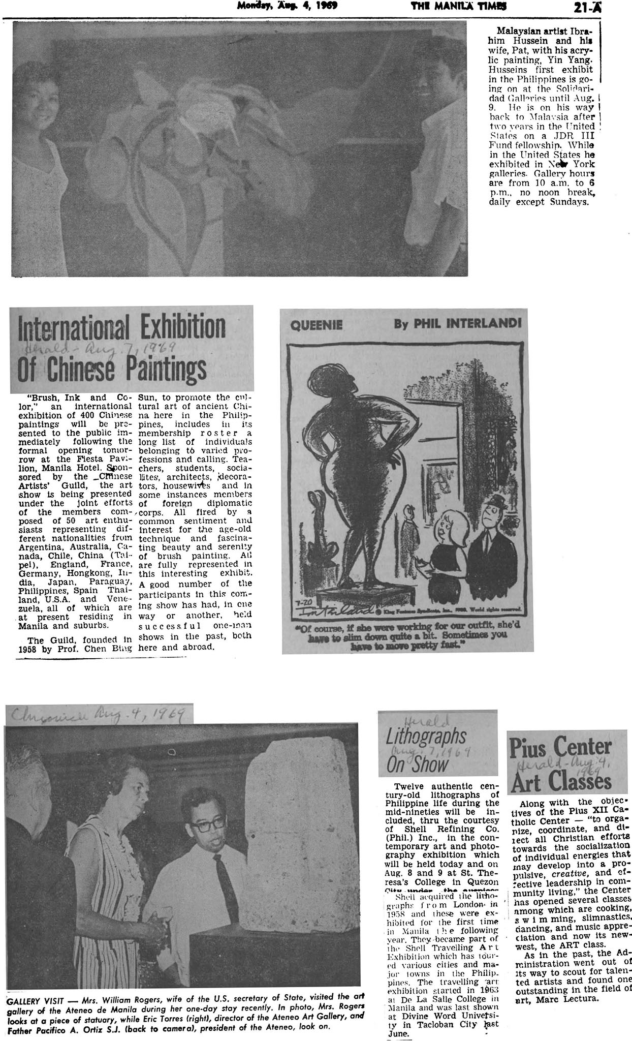 [Photograph of Ibrahim Hussein]; International Exhibition of Chinese Paintings; [Comic Strip: QUEENIE by Phil Interlandi]; GALLERY VISIT; Lithographs on Show; Pius Center Art Classes