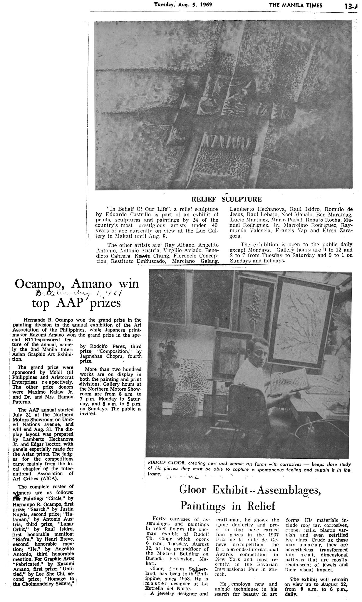 Relief Sculpture; Ocampo, Amano win top AAP prizes; Gloor Exhibit--Assemblages, Paintings in Relief