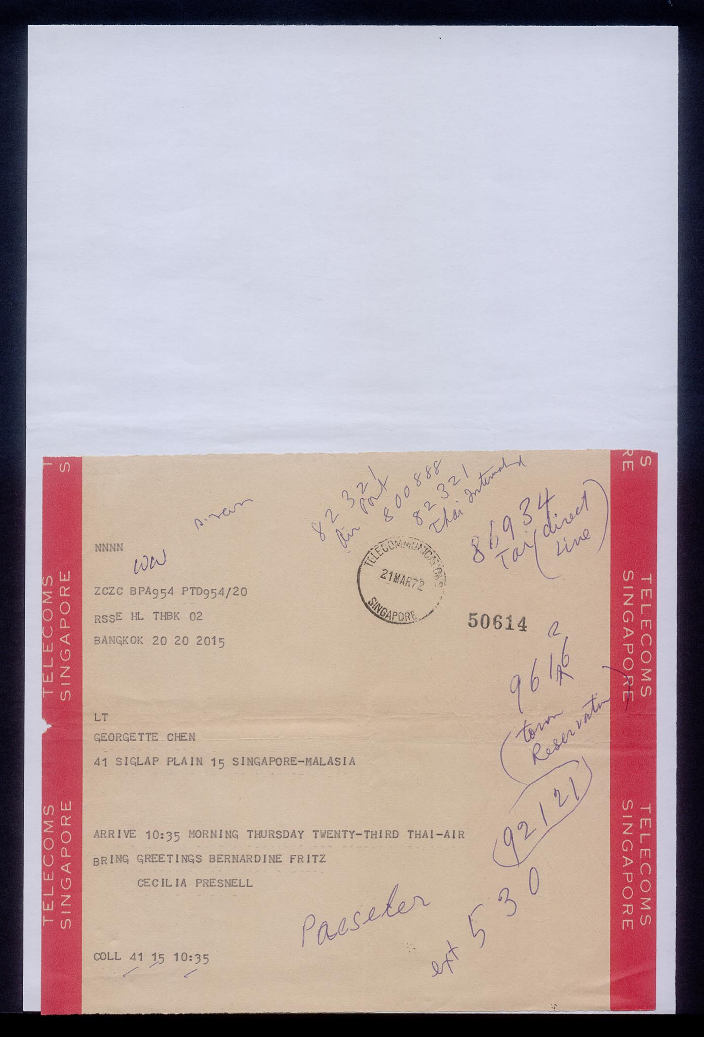 Telegram informing Cecilia Presnall's arrival, 21 March 1972