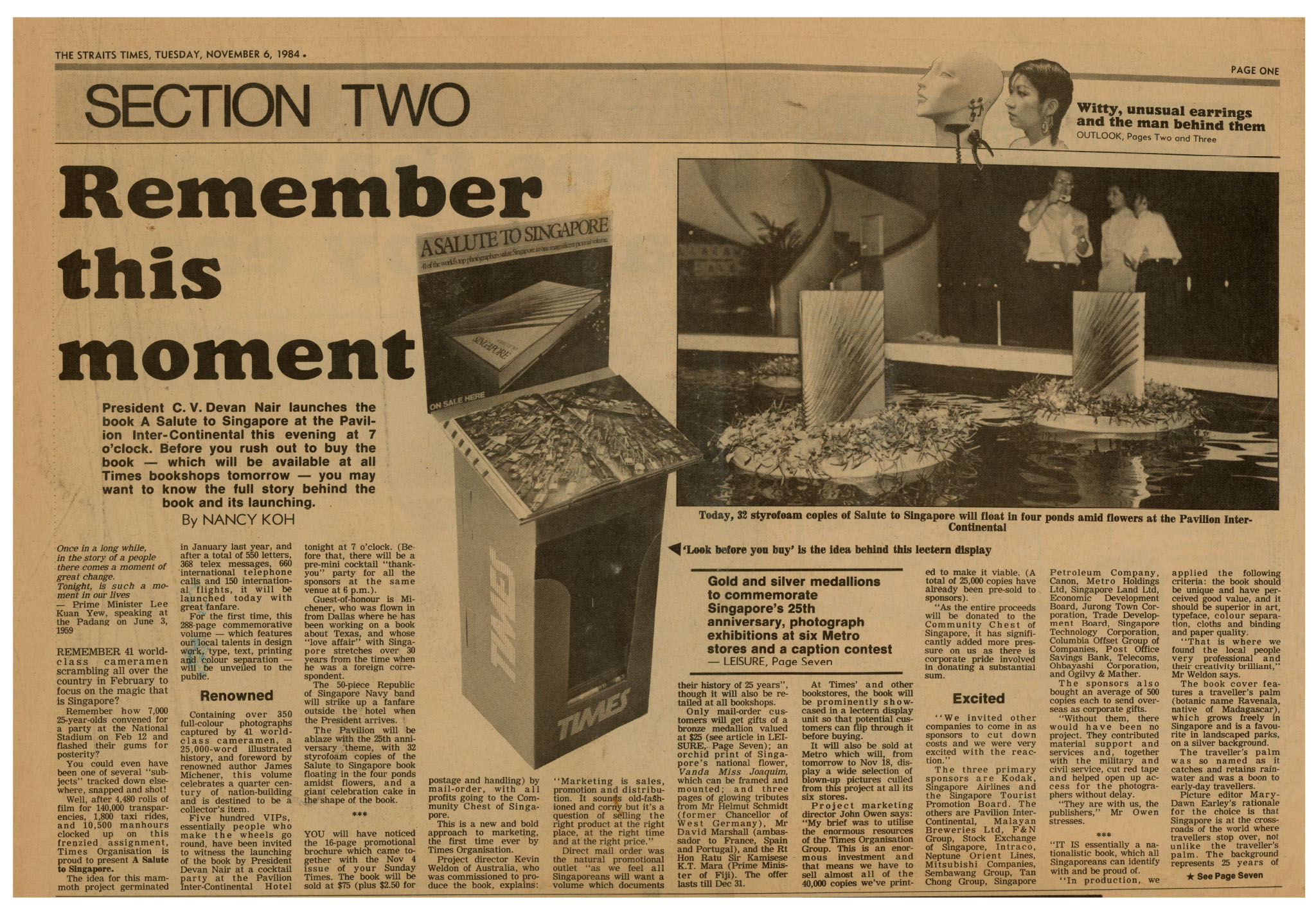 A newspaper article about the official launch of "A Salute to Singapore." It discusses the event's details, such as some of the VIP guests, sponsors, and the book itself, as well as a description of the book's design and the participation of Eng Tow as the designer of the end papers.