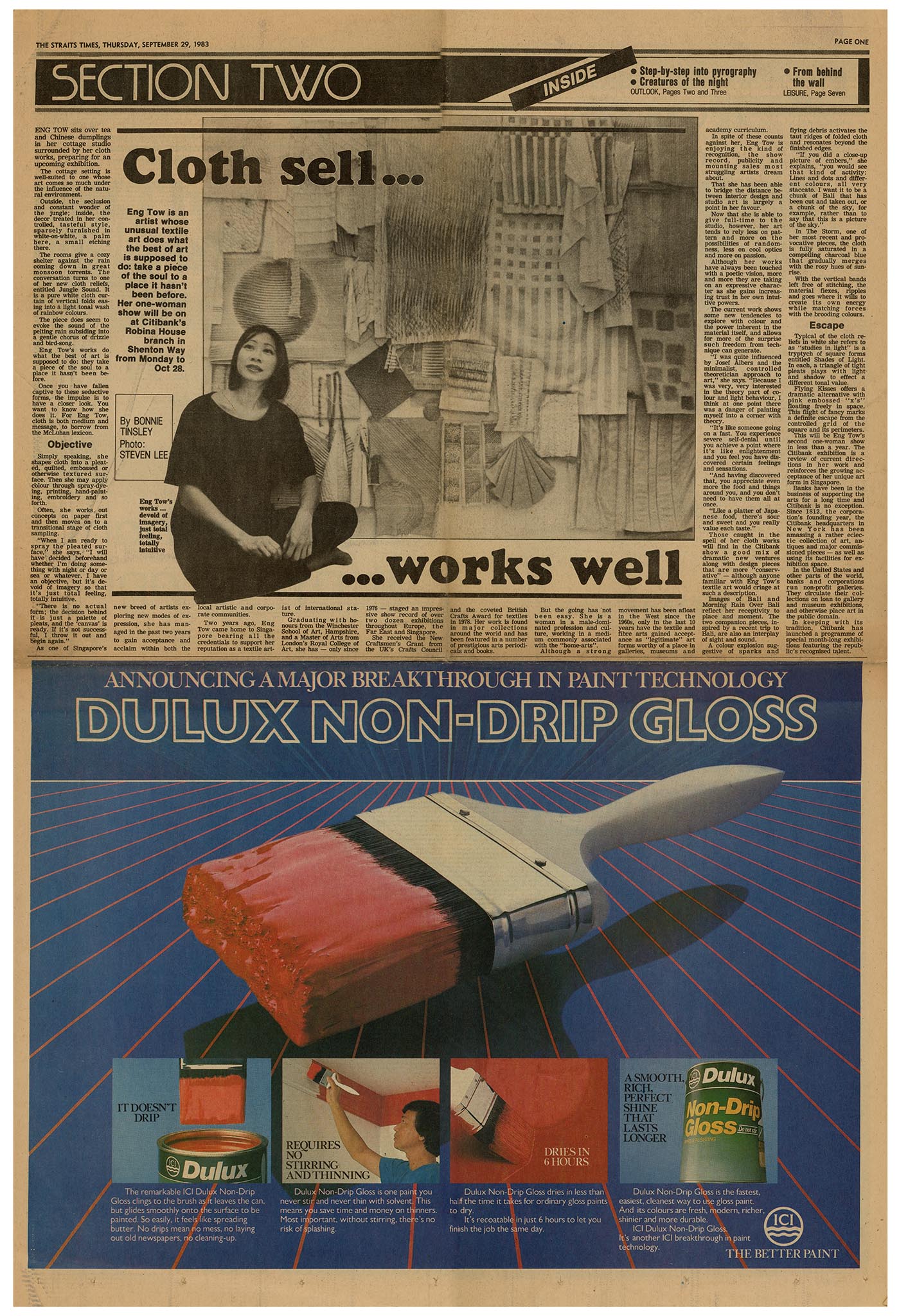 A newspaper article on Eng Tow's art process, including her inspirations, works, and mediums of choice. Eng Tow discusses color, light, and the process of creating her works.