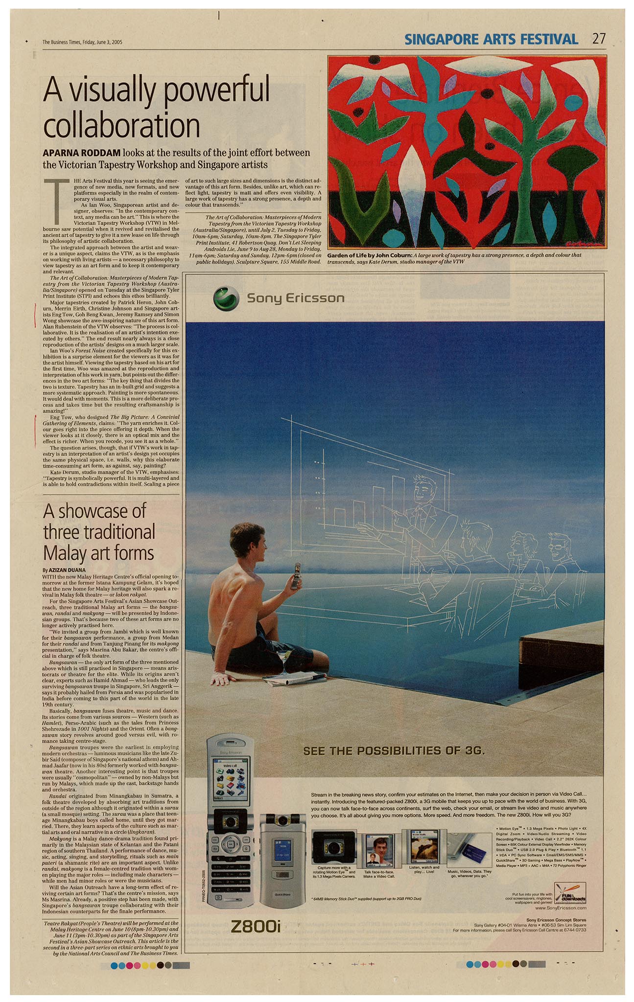 A newspaper article about the exhibition "The Art of Collaboration: Modern Tapestry Masterpieces from the Victorian Tapestry Workshop" (Australia / Singapore). It gives a brief overview of the exhibition, including the featured artists such as Eng Tow and the works.