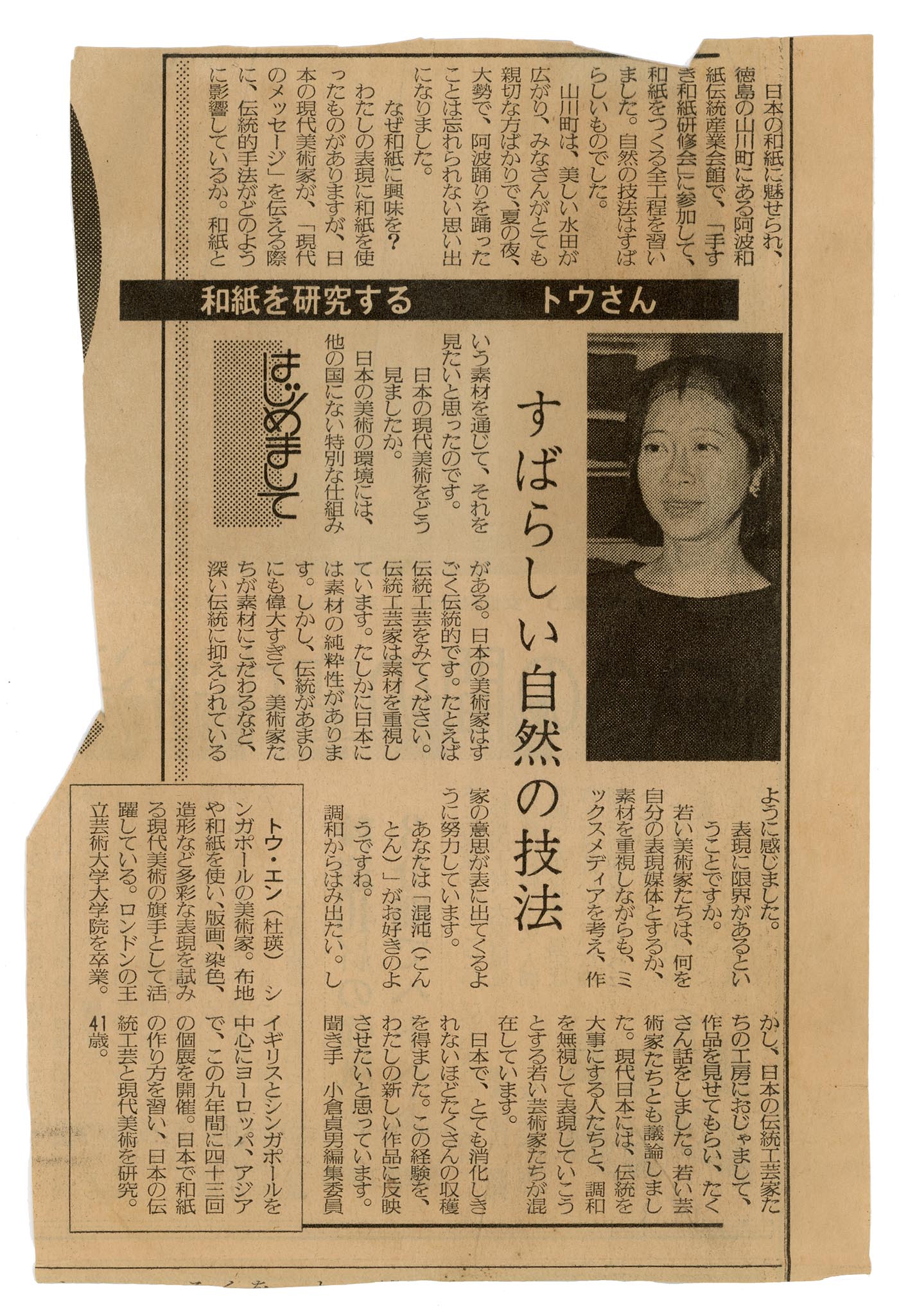 A newspaper article about Eng Tow and paper craft. Eng Tow discusses her interest in Japanese paper, washi, and her art practice in the article.