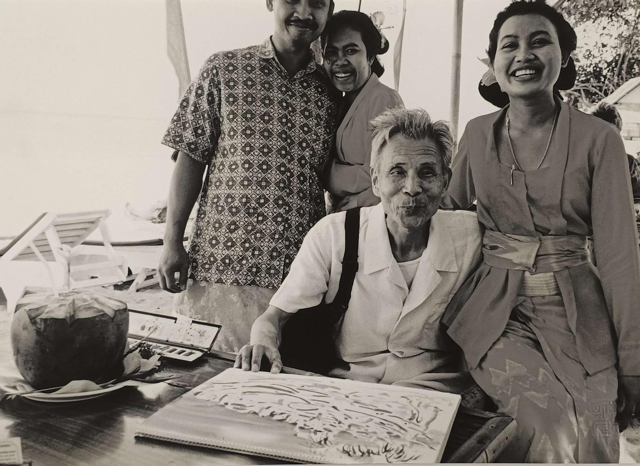 Wu poses for a photo with Balinese locals during an outdoor drawing session. 吴氏在巴厘岛写生时与当地人合影。