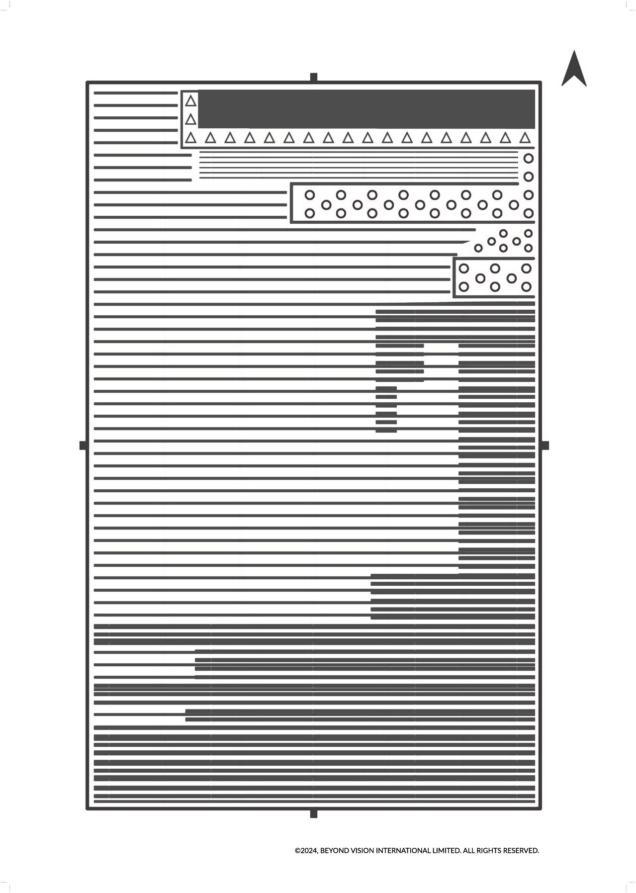 在触感图的右上方,有几排不同的纹理。最上方,一个带有细三角形轮廓的横向长方形,很可能是带黄色窗框的窗户。其下方的圆形纹理,代表暴露在涂漆层后方的砖墙结构。