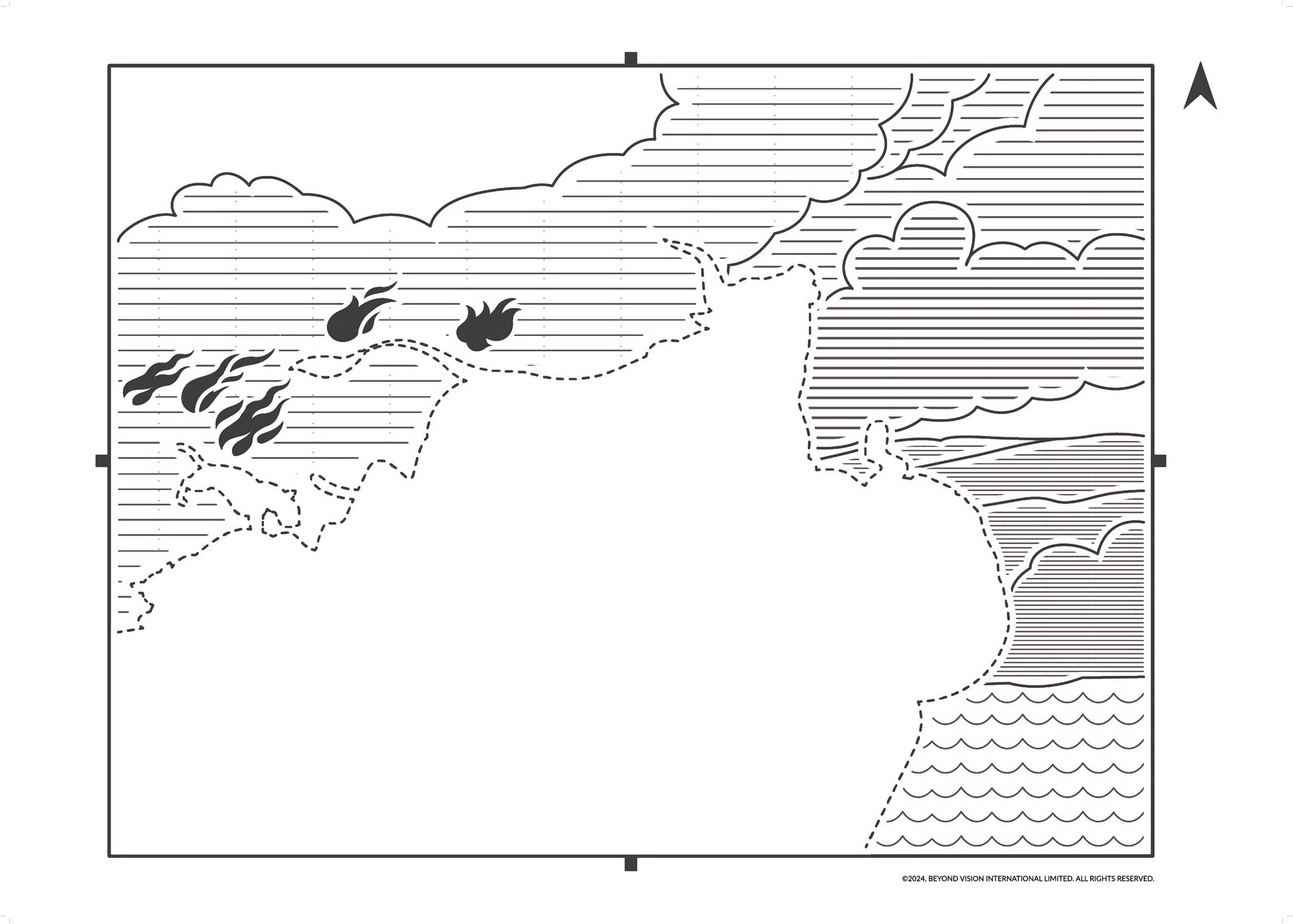 将手指向一点钟方向缓缓移动,您可以找到周围有一个个雾面纹理的尖头图案,代表森林中的熊熊烈火。火势正旺,呈现明亮的红橙色,灰色的烟雾从画面左侧向右侧漫延。您可以将手移至火焰上方,感受天空中的滚滚浓烟。这些烟雾由一条条水平线表示,贯通整幅画作上方。